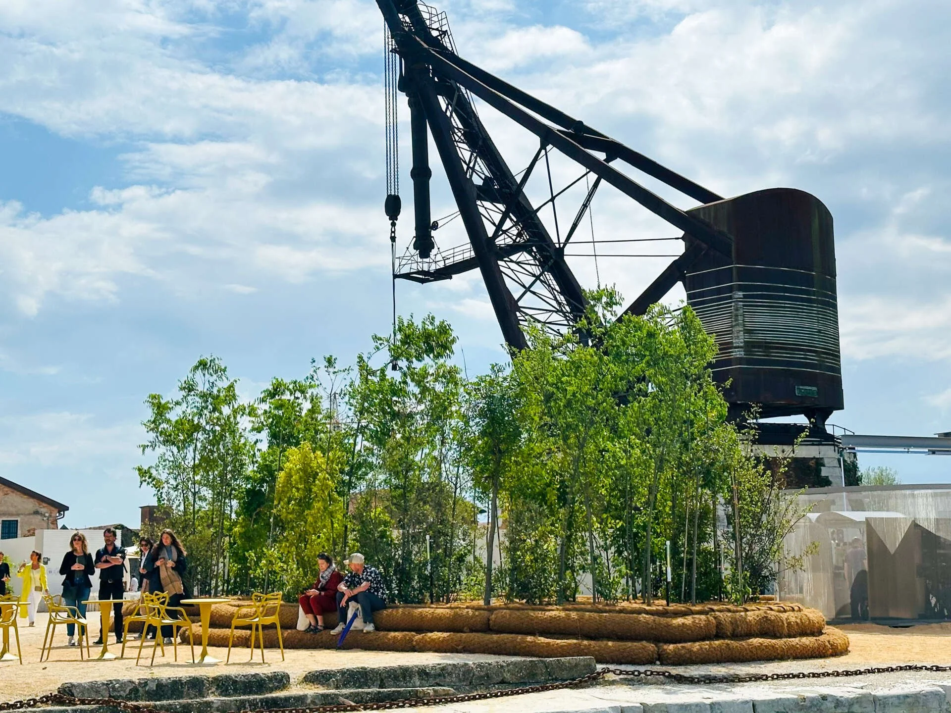 Designed with participating team Marco Scano, Agronomist, and the Harvard Graduate School of Design Department of Landscape Architecture, the forest pavilion spotlights Venice’s changing climate and the role of landscape as essential urban infrastructure. The installation features trees that are adapted to hotter, drier weather—assisting plant migration that is essential in designing resilient landscapes. Embedded sensors track thermal comfort, tree growth, and change within the installation, while an expanded sensor network tracks microclimate conditions across the city of Venice. Lined with coir logs that double as shady comfortable seating, elements of the installation will be planted and redeployed in the city and lagoon after the exhibition closes.